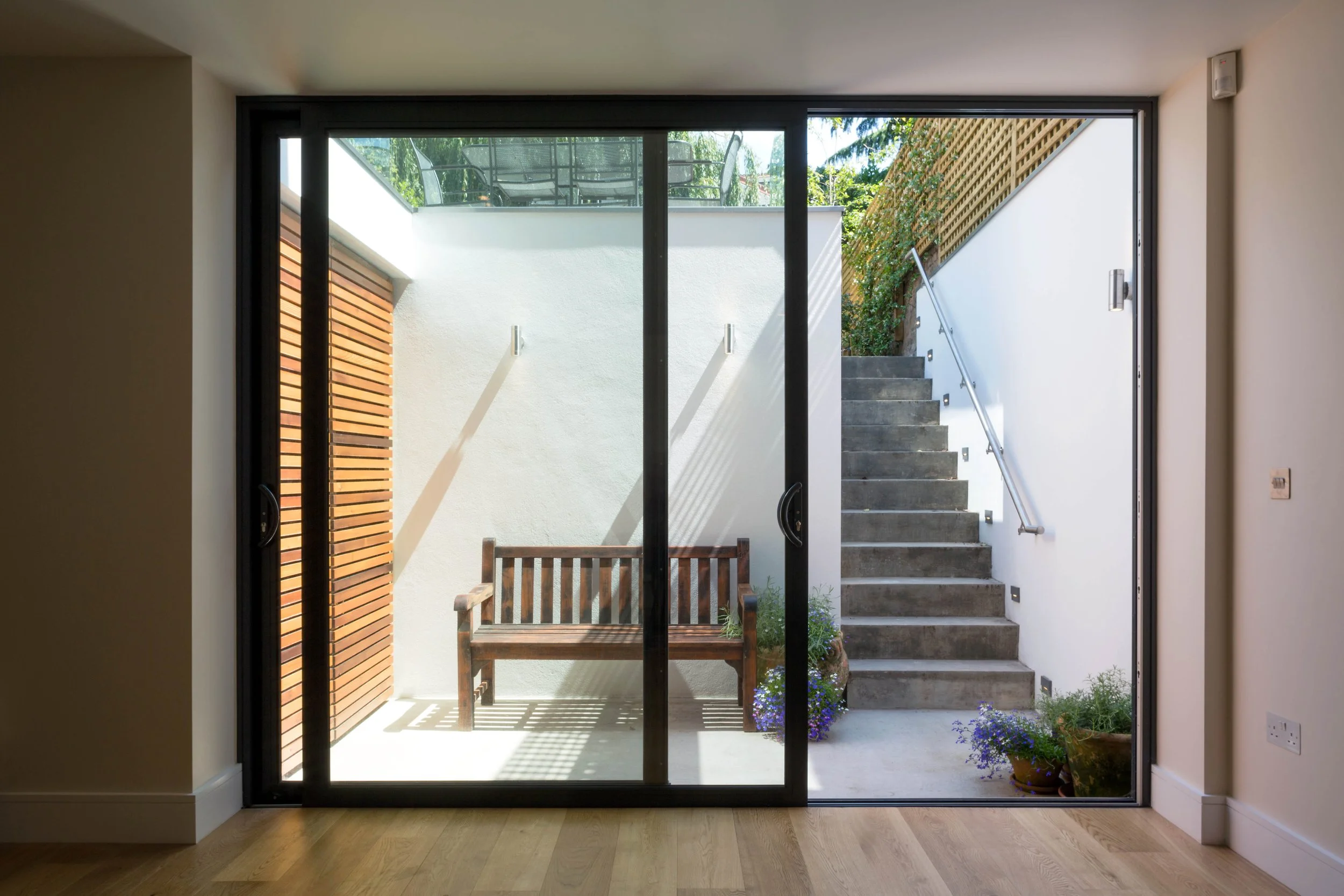 The ground floor extension was conceived as a contemporary box with full width sliding doors and a large rooflight. The sliding doors can be arranged in various configurations, either creating a balcony effect overlooking the lightwell or allowing access to the patio over a bridge. Frost were also asked to design the interior of the house including a bespoke kitchen, bathrooms and joinery items.