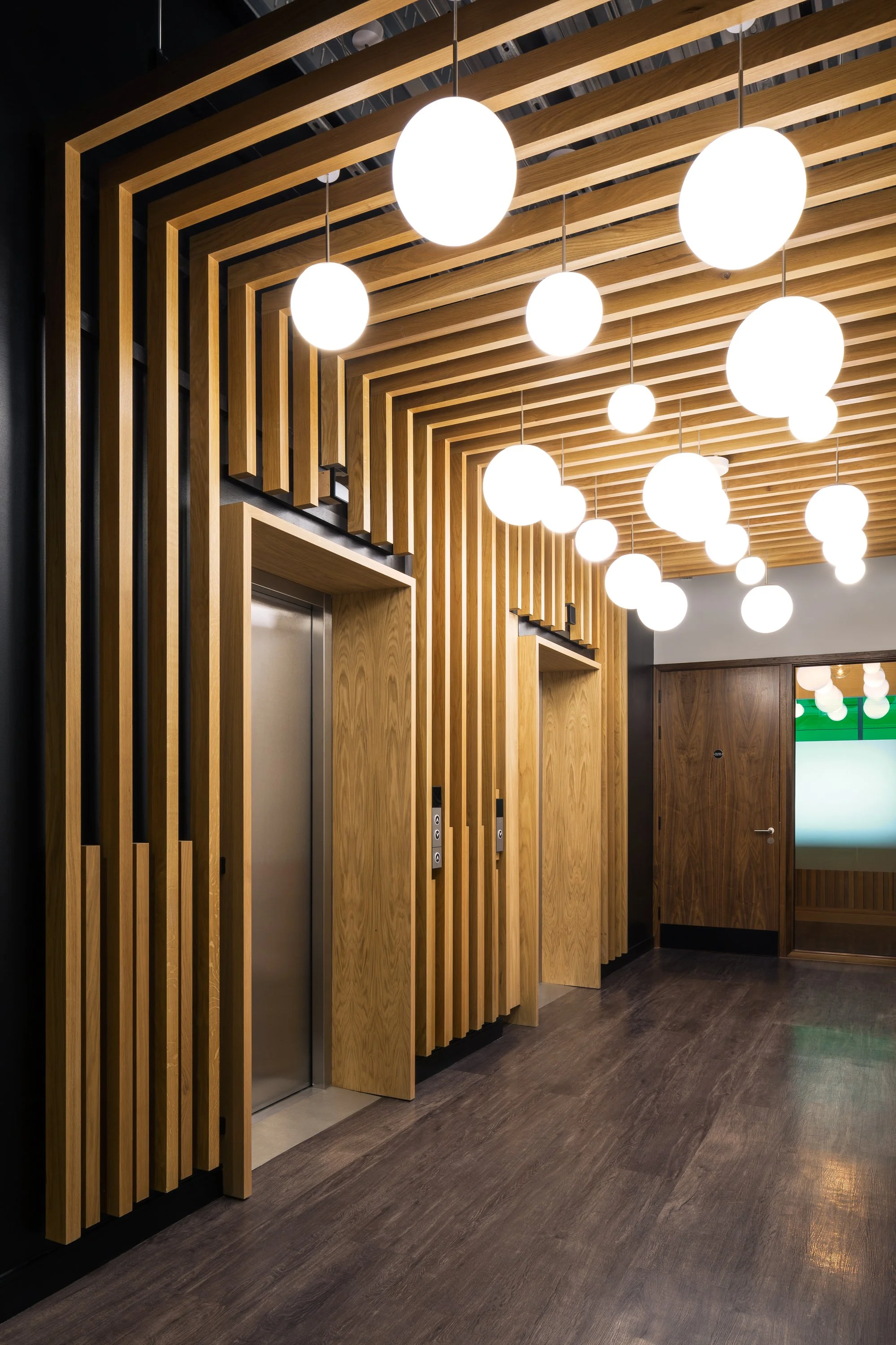 The main circulation cores give the building a professional and high spec public face combining the use of oak battens, globe light fittings and a black and white palette. The tea points and WC’s extend this monochromatic background with clean detailing such as flush full height cubicles and Dolphin sensor handwash systems.